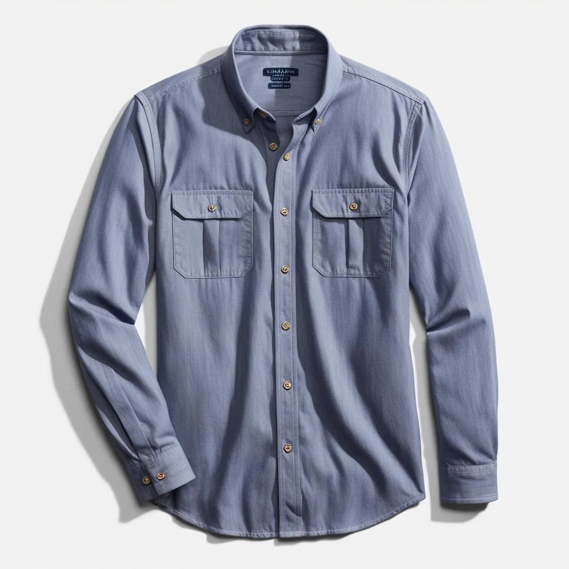 Versatile chambray shirt in a medium wash. Features a modern slim fit with classic button-down collar and dual chest pockets with button closures. Perfect for both casual and smart-casual occasions.