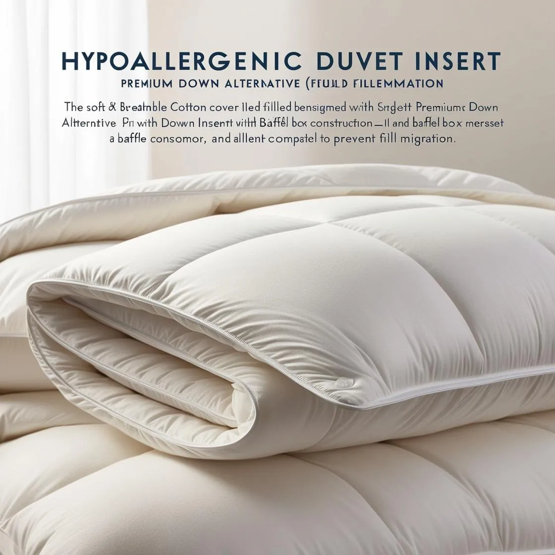 Hypoallergenic duvet insert filled with premium down alternative. The baffle box construction prevents fill migration while the breathable cotton cover ensures comfort. Offers warmth without weight for year-round use.