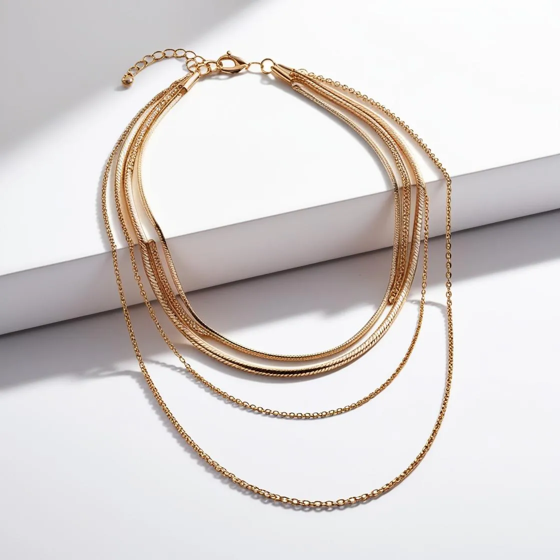Contemporary layered necklace featuring multiple delicate chains of varying lengths. Crafted from gold-plated brass for a luxurious appearance at an accessible price point. Perfect for adding visual interest to simple necklines.